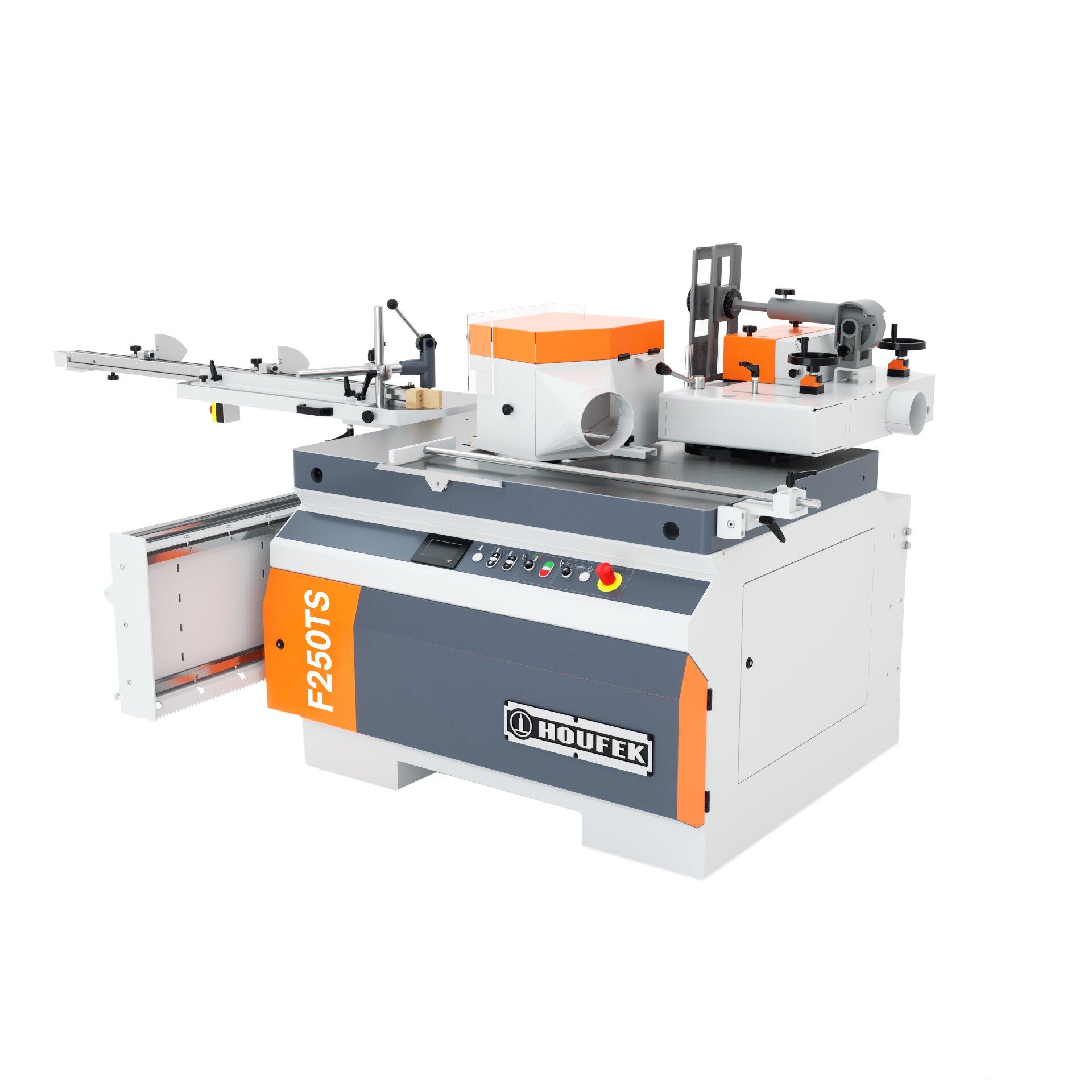 The F 250 TS is a top-tier spindle moulder intended for professional milling and tenoning in woodworking production. Standard features include motorized spindle tilting within a ±45° range, a motorized spindle lift up to 200 mm, digital parameter display, and a powerful 7.5 kW motor. It also comes with a side tenoning carriage featuring a swivel table and guard, a planed worktable measuring 1300 × 900 mm, and the capacity to handle large tools (up to Ø 350 mm). With precise controls and a stable construction, it is an ideal choice for demanding operations.